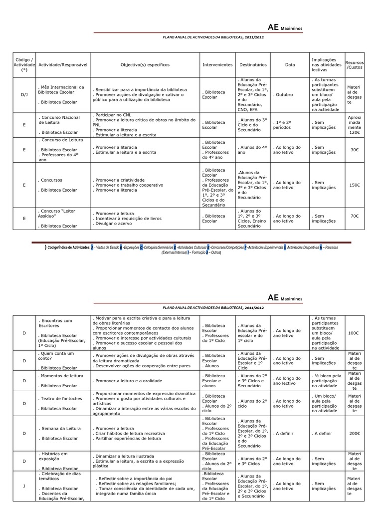 ) Cdigo/ndice de Actividades: A - Visitas de Estudo B -Exposies C -Colquios/Seminrios D -Actividades Culturais/ E -Concursos/Competies F -Actividades Experimentais G Actividades Desportivas H Parcerias