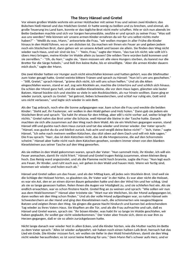 - "Still, Gretel," sprach Hänsel, "gräme dich nicht, ich will uns schon helfen." Und als die Alten