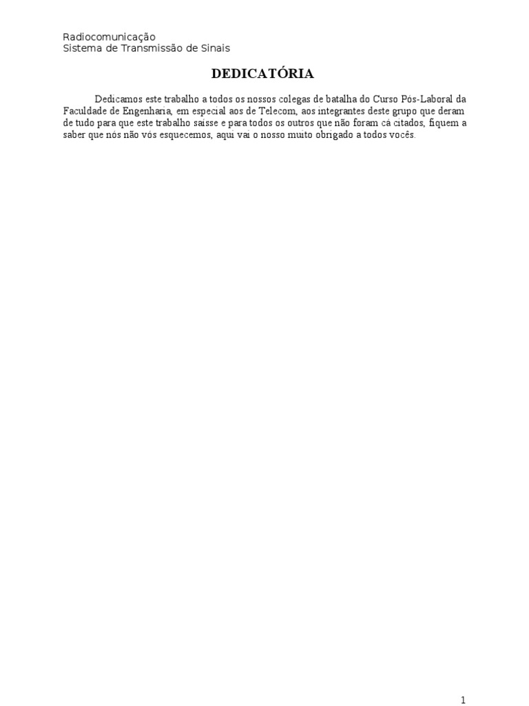 Dedicamos este trabalho a todos os nossos colegas de batalha do Curso Ps-Laboral da Faculdade de Engenharia, em especial aos de Telecom, aos integrantes deste grupo que deram de tudo para que este trabalho sasse e para todos os outros que no foram c citados, fiquem a saber que ns no vs esquecemos, aqui vai o nosso muito obrigado a todos vocs.