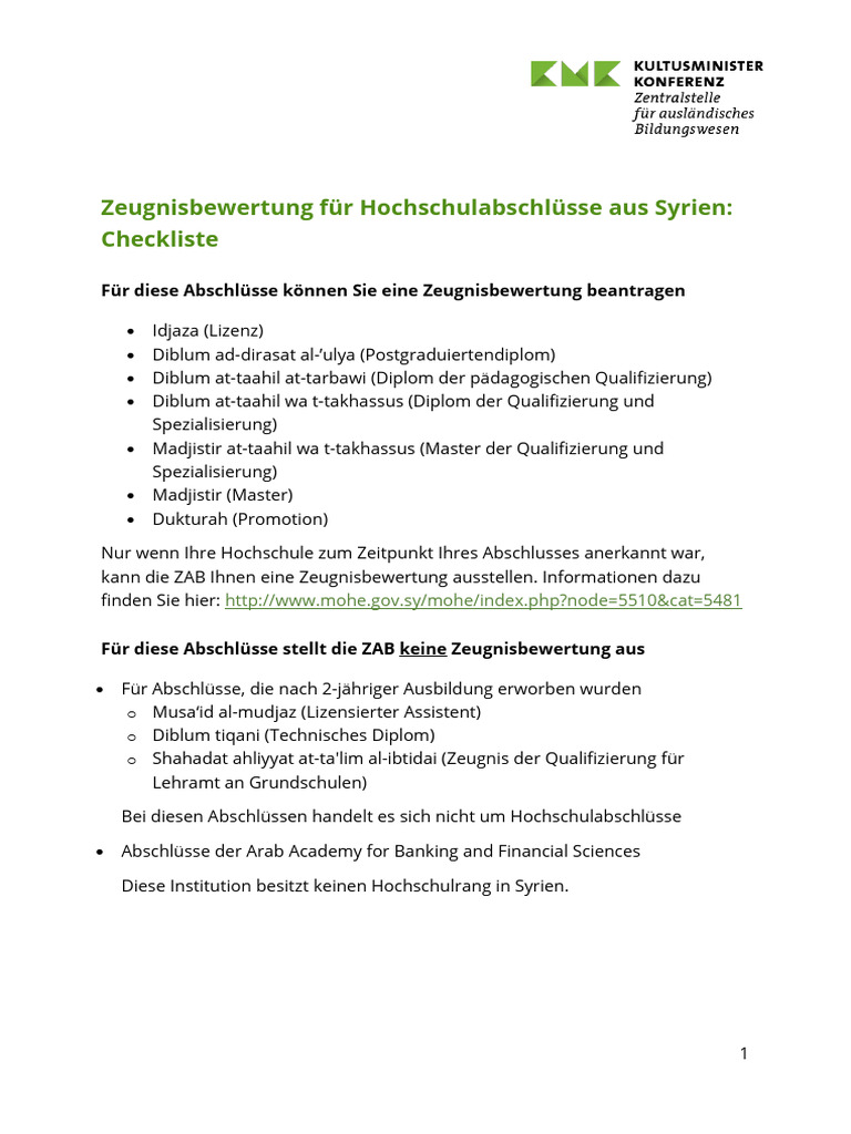 Zeugnisbewertung für Hochschulabschlüsse aus Syrien: