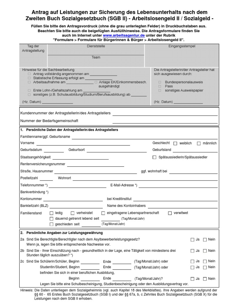 Antrag auf Leistungen zur Sicherung des Lebensunterhalts nach dem Zweiten Buch Sozialgesetzbuch (SGB II) - Arbeitslosengeld