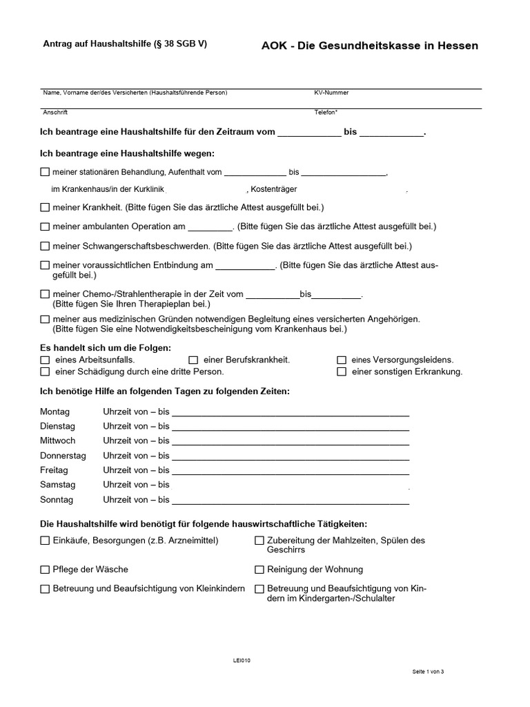 Antrag auf Haushaltshilfe (§ 38 SGB V) AOK - Die Gesundheitskasse in Hessen