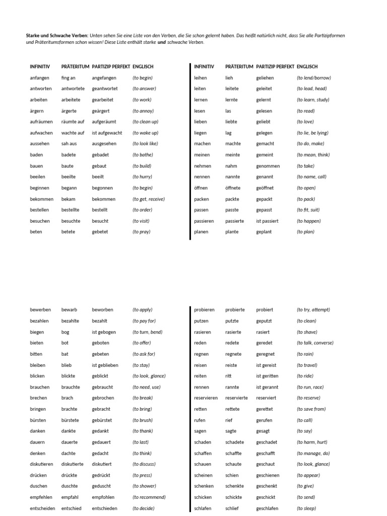und Präteritumsformen schon wissen! Diese Liste enthält starke und schwache Verben.