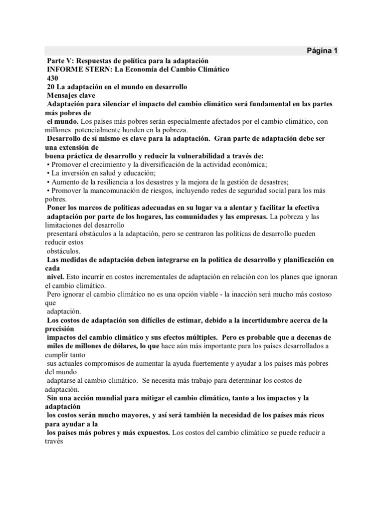 devices of households and firms. Governments should assist this process. This chapter argued that a first set of actions consists of policies that should already be high on each government's agenda, even in the absence of climate change. The first and best way for governments to accelerate adaptation is to promote development successfully. Si individuals and communities are empowered by development and rendered less vulnerable overall, they will be better able to adapt to changes in their environment. Second, improving disaster preparedness and management saves lives, but it also promotes early and costeffective adaptation to climate-change risks. But, in addition, governments should adopt new policies targeted at the climate-change amenaza. One important new task for governments will be to provide firms and communities with high-quality information and tools for dealing with climate change. Governments will also have an important role in encouraging effective adaptation through the use of regulation. Ms generally, in light of the far-reaching implications of climate change, governments should integrate adaptation into their development projects and plans across the board. Investing in climate resilience has implications for each country's investments in natural, physical, human, technological, and social capital. There will be barriers and obstacles to these climate policies that will have to be taken into consideration but development progress will help to address and overcome these constraints. With all of these needs, the incremental investment costs of adaptation are projected to run into many billions of dollars a year for developing countries, including very poor countries that are already hard pressed to meet development goals. On top of those costs, these countries will have to bear the costs of the climate-change impacts that remain even after adaptation. Chapter 26 will return to the question of how the international community can best help developing countries adapt. Pgina 15 Part V: Policy Responses for Adaptation INFORME STERN: La Economa del Cambio Climtico 444 Referencias Acclimatise (2006): 'Review of adaptation to climate risks by cities', London: London Climate Chamge Partnership, available from http://www.london.gov.uk/climatechangepartnership/adapting-jul06.jsp Agrawala, S. (ed.) (2005): 'Bridge over troubled waters: Linking climate change and development', Paris: OECD. Baer, P. (2006): 'Adaptation: who pays whom?', in pp. 131-153, WN Adger, J. Paavola, S. Huq, MJ Mace (eds.), Fairness in Adaptation to Climate Change, Cambridge: MIT Press. Benson, C. (1998): 'The cost of disasters. Development at risk?', in Natural disasters and the third world. J. Twigg (ed.) Oxford: Oxford Centre for Disaster Studies Benson, C. and Clay, E. (2004): Understanding the economic and financial impacts of natural disasters, World Bank, Disaster Risk Management Series No. 4, 2004, Washington DC: Del Banco Mundial. Berkhout, F. (2005): 'Rationales for adaptation in EU climate change policies', Climate Policy 5 : 377 391 Bettencourt, S., R. Croad, P. Freeman, et al. (2006): 'Not if but when: adapting to natural