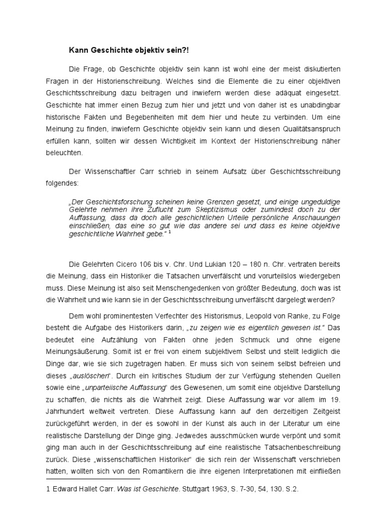 Die Frage, ob Geschichte objektiv sein kann ist wohl eine der meist diskutierten Fragen in der Historienschreibung. Welches sind die Elemente die zu einer objektiven Geschichtsschreibung dazu beitragen und inwiefern werden diese adquat eingesetzt. Geschichte hat immer einen Bezug zum hier und jetzt und von daher ist es unabdingbar historische Fakten und Begebenheiten mit dem hier und heute zu verbinden. Um eine Meinung zu finden, inwiefern Geschichte objektiv sein kann und diesen Qualittsanspruch erfllen kann, sollten wir dessen Wichtigkeit im Kontext der Historienschreibung nher beleuchten. Der Wissenschaftler Carr schrieb in seinem Aufsatz ber Geschichtsschreibung folgendes: Der Geschichtsforschung scheinen keine Grenzen gesetzt, und einige ungeduldige Gelehrte nehmen ihre Zuflucht zum Skeptizismus oder zumindest doch zu der Auffassung, dass da doch alle geschichtlichen Urteile persnliche Anschauungen einschlieen, das eine so gut wie das andere sei und dass es keine objektive geschichtliche Wahrheit gebe. 1