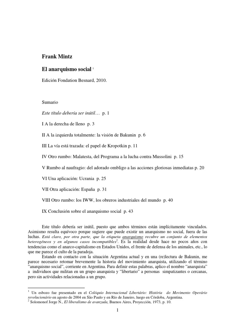 Un esbozo fue presentado en el Colquio Internacional Libertrio: Histria do Movimento Operrio revolucionrio en agosto de 2004 en So Paulo y en Ro de Janeiro, luego en Crdoba, Argentina. 2 Solomonof Jorge N., El liberalismo de avanzada, Buenos Aires, Proyeccin, 1973, p. 10.