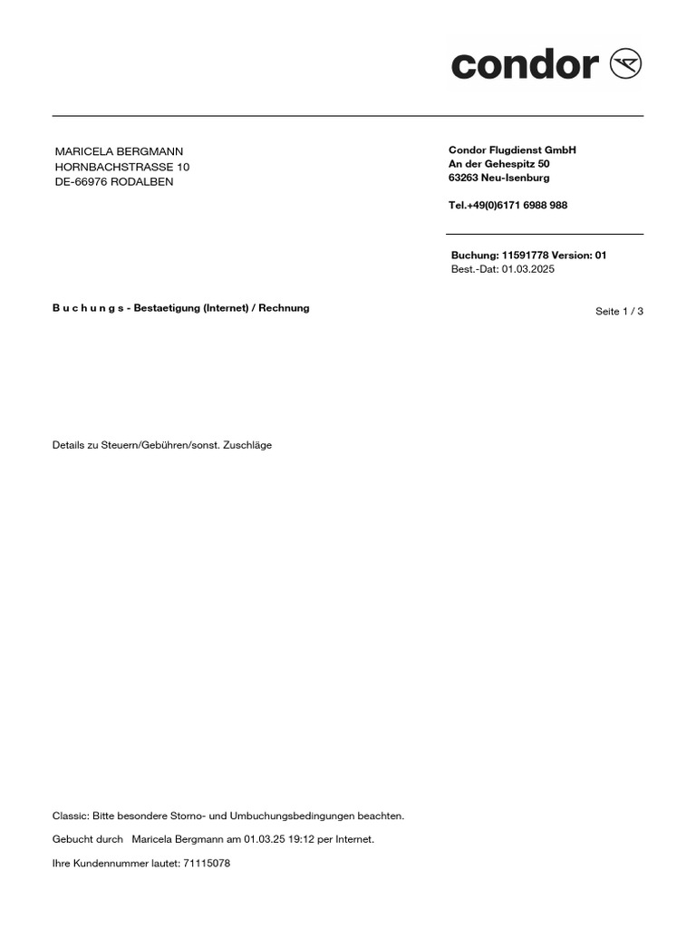 Ihren Flug. Es gelten die Allgemeinen Geschäftsbedingungen, einzusehen im Internet unter http://www.condor.com/de/ hilfe-