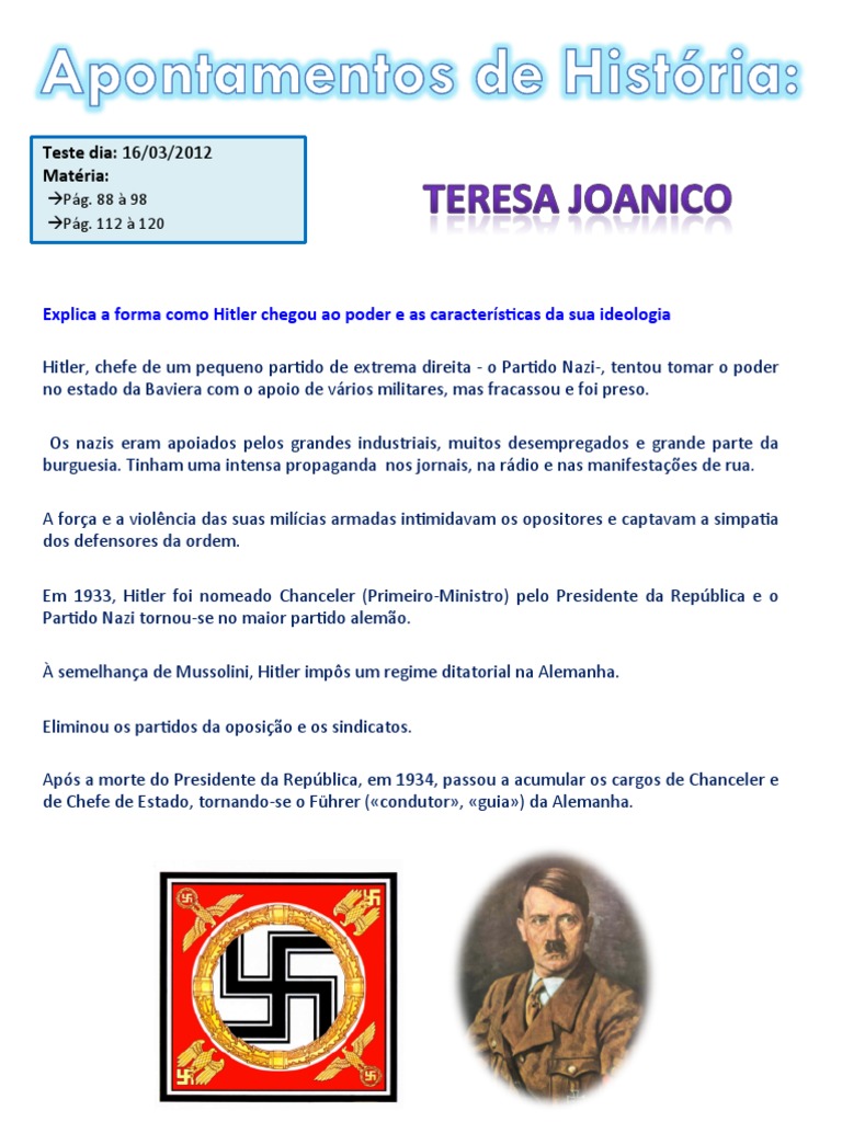 Explica a forma como Hitler chegou ao poder e as caracters6cas da sua ideologia Hitler, chefe de um pequeno par4do de extrema direita - o Par4do Nazi-, tentou tomar o poder no estado da Baviera com o apoio de vrios militares, mas fracassou e foi preso. Os nazis eram apoiados pelos grandes industriais, muitos desempregados e grande parte da burguesia. Tinham uma intensa propaganda nos jornais, na rdio e nas manifestaes de rua. A fora e a violncia das suas milcias armadas in4midavam os opositores e captavam a simpa4a dos defensores da ordem. Em 1933, Hitler foi nomeado Chanceler (Primeiro-Ministro) pelo Presidente da Repblica e o Par4do Nazi tornou-se no maior par4do alemo. semelhana de Mussolini, Hitler imps um regime ditatorial na Alemanha. Eliminou os par4dos da oposio e os sindicatos. Aps a morte do Presidente da Repblica, em 1934, passou a acumular os cargos de Chanceler e de Chefe de Estado, tornando-se o Fhrer (condutor, guia) da Alemanha.