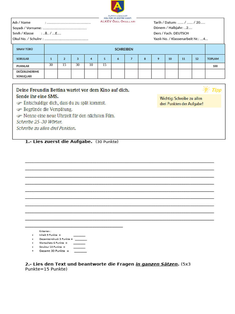 Okul No. / Schulnr : ............................................ Yazılı No. / Klassenarbeit Nr.: ...4…