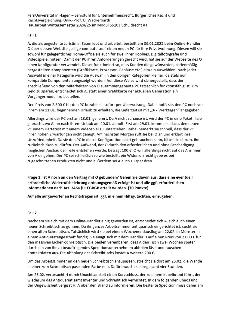 Hausarbeit Wintersemester 2024/25 im Modul 55103 Schuldrecht AT