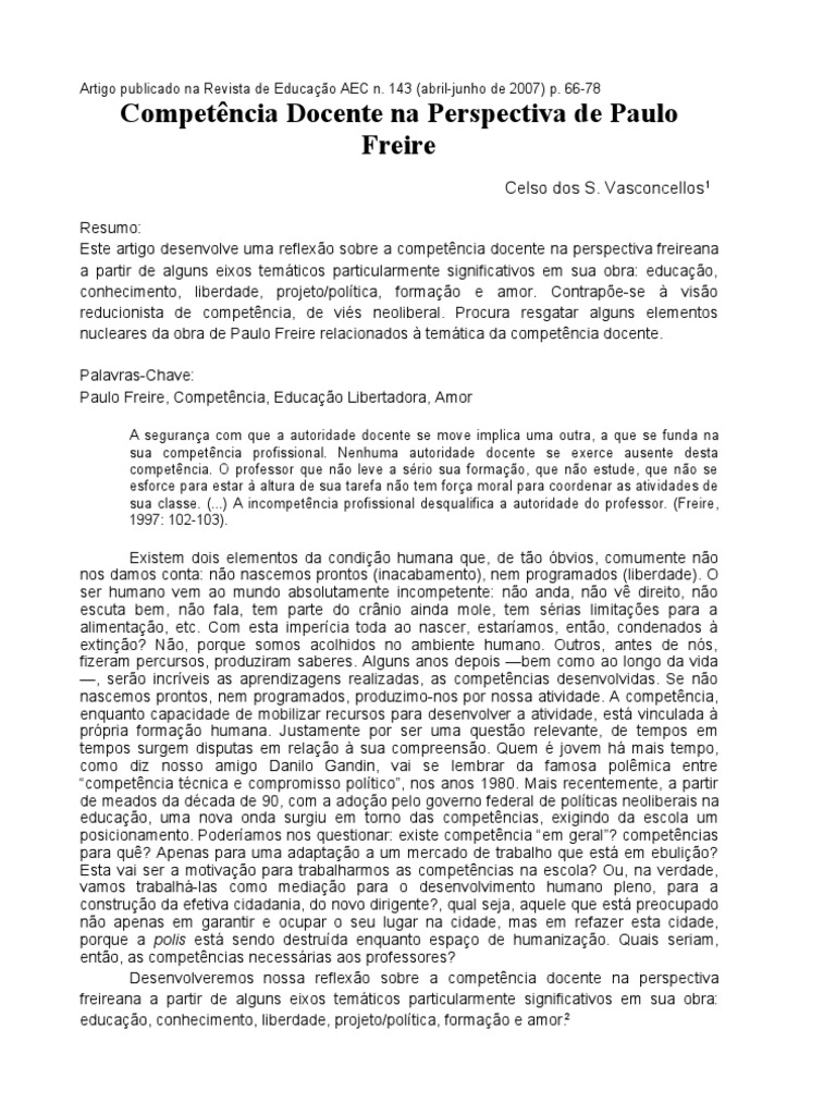 Este artigo desenvolve uma reflexão sobre a competência docente na perspectiva freireana
