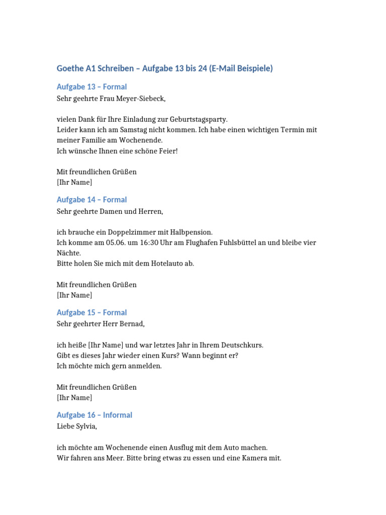 Goethe A1 Schreiben – Aufgabe 13 bis 24 (E-Mail Beispiele)