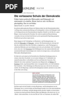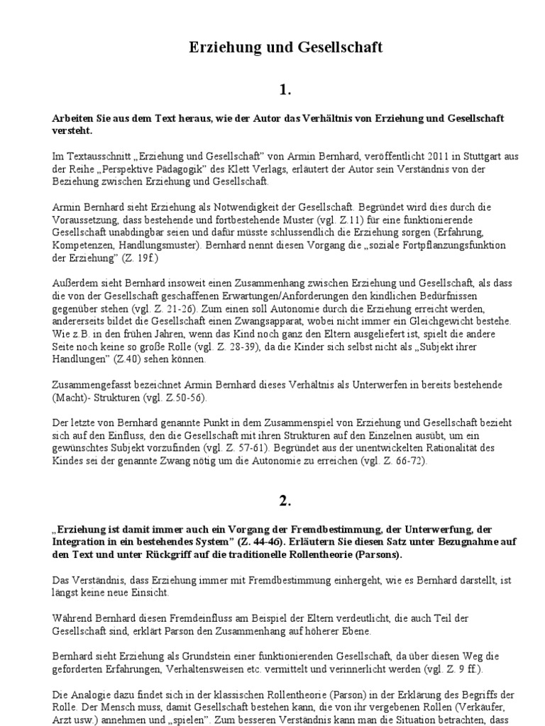 Arbeiten Sie aus dem Text heraus, wie der Autor das Verhltnis von Erziehung und Gesellschaft versteht. Im Textausschnitt Erziehung und Gesellschaft von Armin Bernhard, verffentlicht 2011 in Stuttgart aus der Reihe Perspektive Pdagogik des Klett Verlags, erlutert der Autor sein Verstndnis von der Beziehung zwischen Erziehung und Gesellschaft. Armin Bernhard sieht Erziehung als Notwendigkeit der Gesellschaft. Begrndet wird dies durch die Voraussetzung, dass bestehende und fortbestehende Muster (vgl. Z.11) fr eine funktionierende Gesellschaft unabdingbar seien und dafr msste schlussendlich die Erziehung sorgen (Erfahrung, Kompetenzen, Handlungsmuster). Bernhard nennt diesen Vorgang die soziale Fortpflanzungsfunktion der Erziehung (Z. 19f.) Auerdem sieht Bernhard insoweit einen Zusammenhang zwischen Erziehung und Gesellschaft, als dass die von der Gesellschaft geschaffenen Erwartungen/Anforderungen den kindlichen Bedrfnissen gegenber stehen (vgl. Z. 21-26). Zum einen soll Autonomie durch die Erziehung erreicht werden, andererseits bildet die Gesellschaft einen Zwangsapparat, wobei nicht immer ein Gleichgewicht bestehe. Wie z.B. in den frhen Jahren, wenn das Kind noch ganz den Eltern ausgeliefert ist, spielt die andere Seite noch keine so groe Rolle (vgl. Z. 28-39), da die Kinder sich selbst nicht als Subjekt ihrer Handlungen (Z.40) sehen knnen. Zusammengefasst bezeichnet Armin Bernhard dieses Verhltnis als Unterwerfen in bereits bestehende (Macht)- Strukturen (vgl. Z.50-56). Der letzte von Bernhard genannte Punkt in dem Zusammenspiel von Erziehung und Gesellschaft bezieht sich auf den Einfluss, den die Gesellschaft mit ihren Strukturen auf den Einzelnen ausbt, um ein gewnschtes Subjekt vorzufinden (vgl. Z. 57-61). Begrndet aus der unentwickelten Rationalitt des Kindes sei der genannte Zwang ntig um die Autonomie zu erreichen (vgl. Z. 66-72).