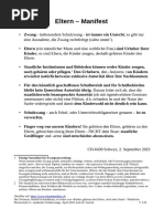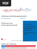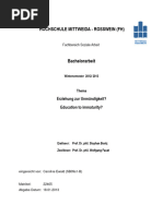 Erziehung ist damit immer auch ein Vorgang der Fremdbestimmung, der Unterwerfung, der Integration in ein bestehendes System (Z. 44-46). Erlutern Sie diesen Satz unter Bezugnahme auf den Text und unter Rckgriff auf die traditionelle Rollentheorie (Parsons). Das Verstndnis, dass Erziehung immer mit Fremdbestimmung einhergeht, wie es Bernhard darstellt, ist lngst keine neue Einsicht. Whrend Bernhard diesen Fremdeinfluss am Beispiel der Eltern verdeutlicht, die auch Teil der Gesellschaft sind, erklrt Parson den Zusammenhang auf hherer Ebene. Bernhard sieht Erziehung als Grundstein einer funktionierenden Gesellschaft, da ber diesen Weg die geforderten Erfahrungen, Verhaltensweisen etc. vermittelt und verinnerlicht werden (vgl. Z. 9 ff.). Die Analogie dazu findet sich in der klassischen Rollentheorie (Parson) in der Erklrung des Begriffs der Rolle. Der Mensch muss, damit Gesellschaft bestehen kann, die von ihr vergebenen Rollen (Verkufer, Arzt usw.) annehmen und spielen. Zum besseren Verstndnis kann man die Situation betrachten, dass man in einem Laden nicht versucht etwas zu verkaufen. Man nimmt die Rolle des Kunden ein und