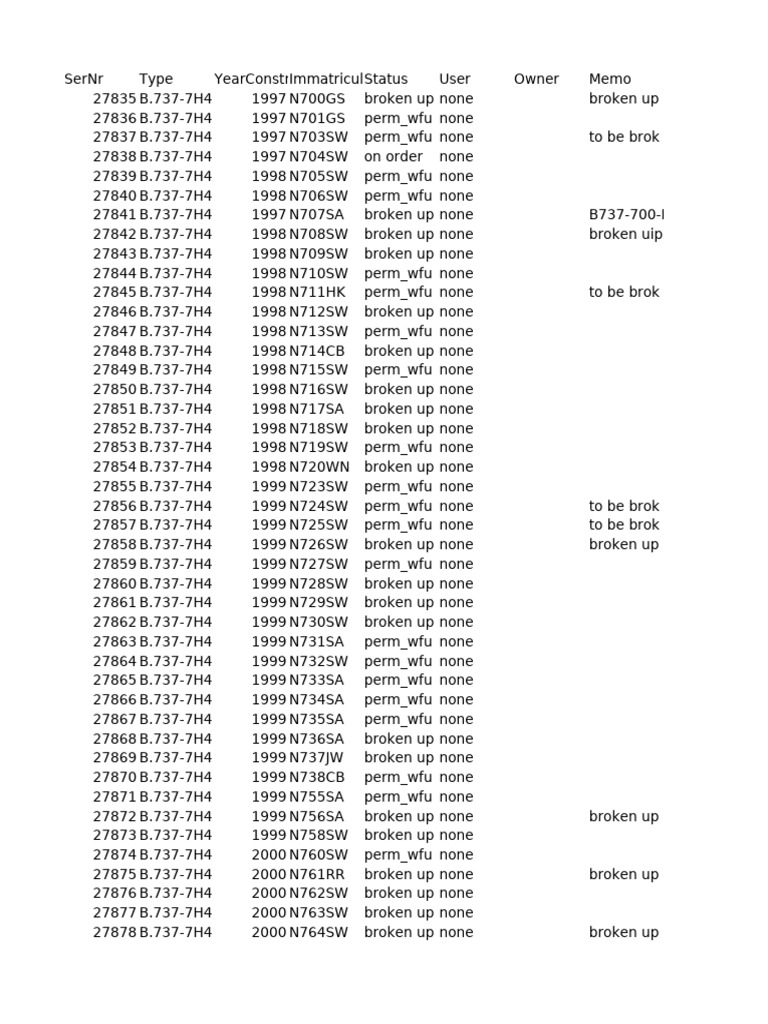 27858 B.737-7H4 1999 N726SW broken up none broken up