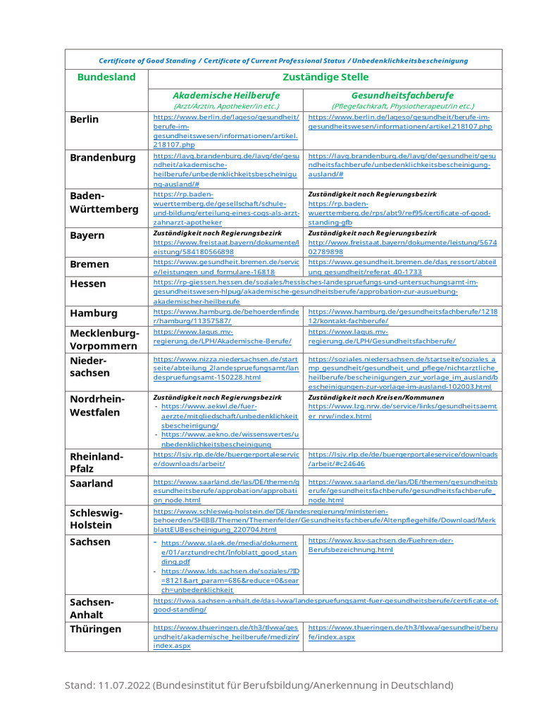 Certificate of Good Standing / Certificate of Current Professional Status / Unbedenklichkeitsbescheinigung