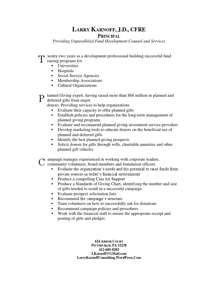lanned Giving expert, having raised more than $68 million in planned and deferred gifts from major donors. Providing services to help organizations Evaluate their capacity to offer planned gifts Establish policies and procedures for the long-term management of planned giving programs Evaluate and recommend planned giving investment service providers Develop marketing tools to educate donors on the beneficial use of planned and deferred gifts Identify the best planned giving prospects Solicit donors for gifts through wills, charitable annuities and other planned gift vehicles ampaign manager experienced in working with corporate leaders, community volunteers, board members and foundation officers Evaluate the organizations needs and the potential to raise funds from private sources in todays financial environment Produce a compelling Case for Support Produce a Standards of Giving Chart, identifying the number and size of gifts needed to result in a successful campaign Evaluate prospect solicitation lists Recommend the campaigns structure Train volunteers on how to successfully ask for donations Recommend campaign policies and procedures Work with the financial staff to ensure the appropriate receipt and posting of gifts and pledges