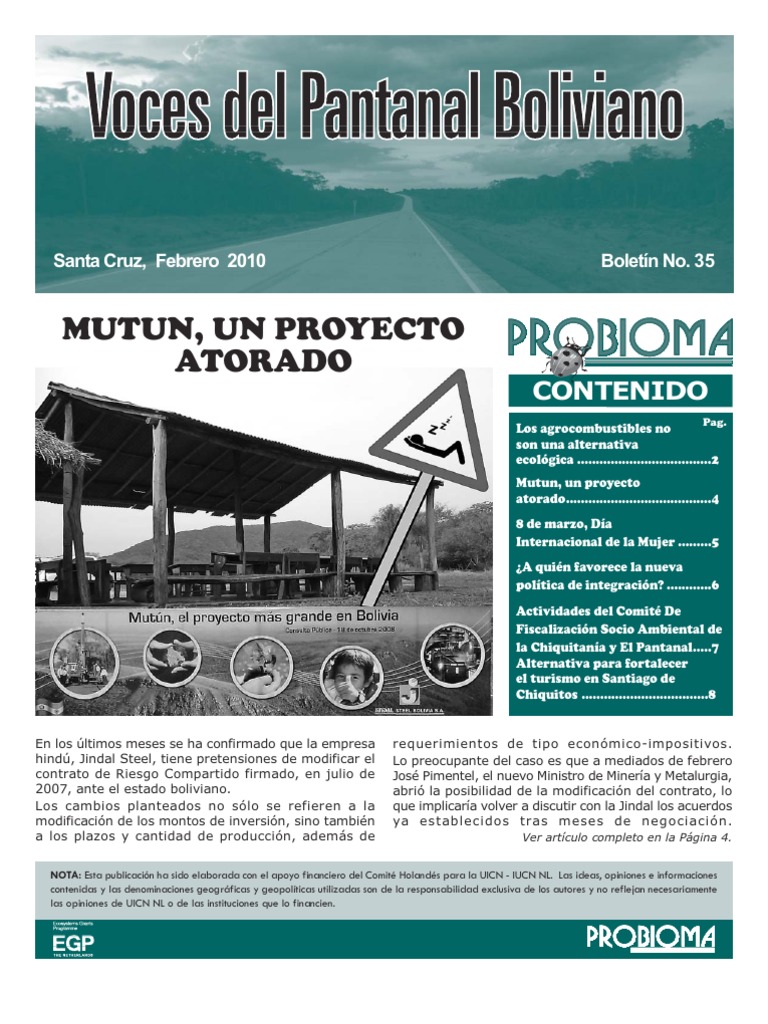 Mutun, un proyecto atorado.......................................4 8 de marzo, Da Internacional de la Mujer .........5 A quin favorece la nueva poltica de integracin? ............6 Actividades del Comit De Fiscalizacin Socio Ambiental de la Chiquitana y El Pantanal.....7 Alternativa para fortalecer el turismo en Santiago de Chiquitos ..................................8