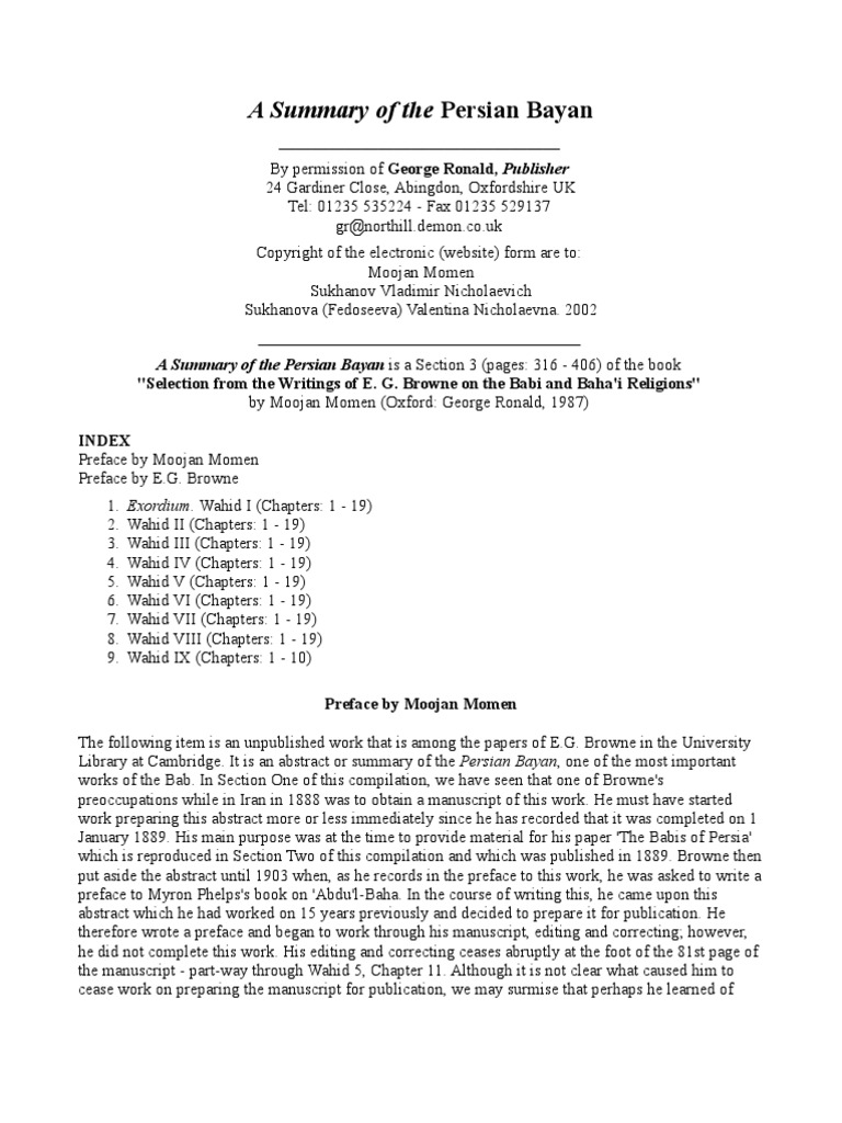 __________________________________ By permission of George Ronald, Publisher 24 Gardiner Close, Abingdon, Oxfordshire UK Tel: 01235 535224 - Fax 01235 529137 gr@northill.demon.co.uk Copyright of the electronic (website) form are to: Moojan Momen Sukhanov Vladimir Nicholaevich Sukhanova (Fedoseeva) Valentina Nicholaevna. 2002 _______________________________________ A Summary of the Persian Bayan is a Section 3 (pages: 316 - 406) of the book "Selection from the Writings of E. G. Browne on the Babi and Baha'i Religions" by Moojan Momen (Oxford: George Ronald, 1987) INDEX Preface by Moojan Momen Preface by E.G. Browne 1. 2. 3. 4. 5. 6. 7. 8. 9. Exordium. Wahid I (Chapters: 1 - 19) Wahid II (Chapters: 1 - 19) Wahid III (Chapters: 1 - 19) Wahid IV (Chapters: 1 - 19) Wahid V (Chapters: 1 - 19) Wahid VI (Chapters: 1 - 19) Wahid VII (Chapters: 1 - 19) Wahid VIII (Chapters: 1 - 19) Wahid IX (Chapters: 1 - 10) Preface by Moojan Momen The following item is an unpublished work that is among the papers of E.G. Browne in the University Library at Cambridge. It is an abstract or summary of the Persian Bayan, one of the most important works of the Bab. In Section One of this compilation, we have seen that one of Browne's preoccupations while in Iran in 1888 was to obtain a manuscript of this work. He must have started work preparing this abstract more or less immediately since he has recorded that it was completed on 1 January 1889. His main purpose was at the time to provide material for his paper 'The Babis of Persia' which is reproduced in Section Two of this compilation and which was published in 1889. Browne then put aside the abstract until 1903 when, as he records in the preface to this work, he was asked to write a preface to Myron Phelps's book on 'Abdu'l-Baha. In the course of writing this, he came upon this abstract which he had worked on 15 years previously and decided to prepare it for publication. He therefore wrote a preface and began to work through his manuscript, editing and correcting; however, he did not complete this work. His editing and correcting ceases abruptly at the foot of the 81st page of the manuscript - part-way through Wahid 5, Chapter 11. Although it is not clear what caused him to cease work on preparing the manuscript for publication, we may surmise that perhaps he learned of