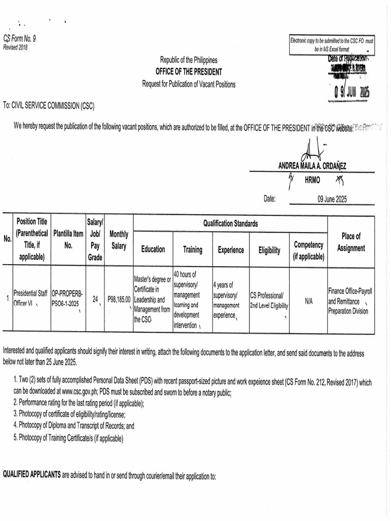 Das Dokument ist eine Anfrage zur Veröffentlichung von vakanten Positionen im Büro des Präsidenten der Philippinen, die bis zum 25. Juni 2025 eingereicht werden müssen. Es enthält Informationen zu den erforderlichen Qualifikationen, Dokumenten und dem Bewerbungsprozess. Zudem wird betont, dass die Gleichbehandlung aller Bewerber unabhängig von persönlichen Merkmalen gewährleistet ist.