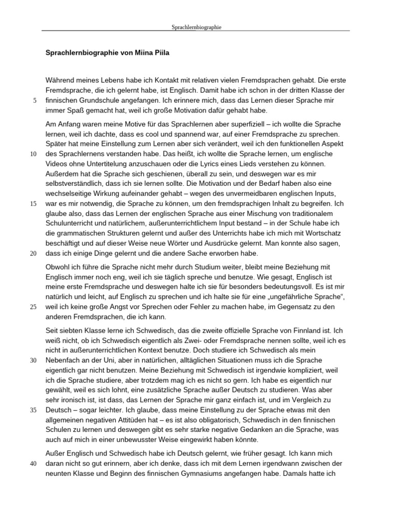 Gelernte, erwähnte Sprachen (L2): Englisch, Schwedisch, Deutsch, Russisch, Spanisch,