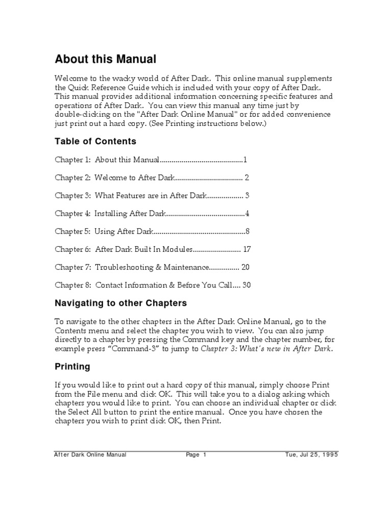 Welcome to the wacky world of After Dark. This online manual supplements the Quick Reference Guide which is included with your copy of After Dark. This manual provides additional information concerning specific features and operations of After Dark. You can view this manual any time just by double-clicking on the "After Dark Online Manual" or for added convenience just print out a hard copy. (See Printing instructions below.)