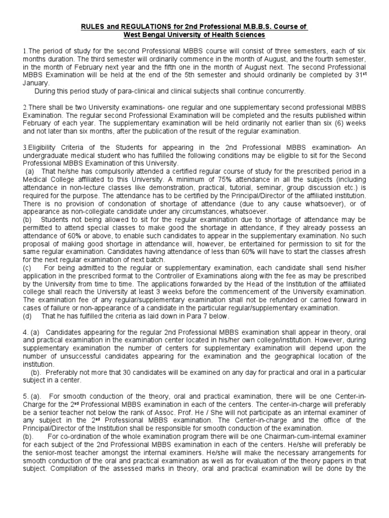 The period of study for the second Professional MBBS course will consist of three semesters, each of six months duration. The third semester will ordinarily commence in the month of August, and the fourth semester, in the month of February next year and the fifth one in the month of August next. The second Professional MBBS Examination will be held at the end of the 5th semester and should ordinarily be completed by 31st January. During this period study of para-clinical and clinical subjects shall continue concurrently. 2.There shall be two University examinations- one regular and one supplementary second professional MBBS Examination. The regular second Professional Examination will be completed and the results published within February of each year. The supplementary examination will be held ordinarily not earlier than six (6) weeks and not later than six months, after the publication of the result of the regular examination. 3.Eligibility Criteria of the Students for appearing in the 2nd Professional MBBS examination- An undergraduate medical student who has fulfilled the following conditions may be eligible to sit for the Second Professional MBBS Examination of this University. (a) That he/she has compulsorily attended a certified regular course of study for the prescribed period in a Medical College affiliated to this University. A minimum of 75% attendance in all the subjects (including attendance in non-lecture classes like demonstration, practical, tutorial, seminar, group discussion etc.) is required for the purpose. The attendance has to be certified by the Principal/Director of the affiliated institution. There is no provision of condonation of shortage of attendance (due to any cause whatsoever), or of appearance as non-collegiate candidate under any circumstances, whatsoever. (b) Students not being allowed to sit for the regular examination due to shortage of attendance may be permitted to attend special classes to make good the shortage in attendance, if they already possess an attendance of 60% or above, to enable such candidates to appear in the supplementary examination. No such proposal of making good shortage in attendance will, however, be entertained for permission to sit for the same regular examination. Candidates having attendance of less than 60% will have to start the classes afresh for the next regular examination of next batch. (c) For being admitted to the regular or supplementary examination, each candidate shall send his/her application in the prescribed format to the Controller of Examinations along with the fee as may be prescribed by the University from time to time. The applications forwarded by the Head of the Institution of the affiliated college shall reach the University at least 3 weeks before the commencement of the University examination. The examination fee of any regular/supplementary examination shall not be refunded or carried forward in cases of failure or non-appearance of a candidate in the particular regular/supplementary examination. (d) That he has fulfilled the criteria as laid down in Para 7 below. 4. (a) Candidates appearing for the regular 2nd Professional MBBS examination shall appear in theory, oral and practical examination in the examination center located in his/her own college/institution. However, during supplementary examination the number of centers for supplementary examination will depend upon the number of unsuccessful candidates appearing for the examination and the geographical location of the institution. (b). Preferably not more that 30 candidates will be examined on any day for practical and oral in a particular subject in a center. 5. (a). For smooth conduction of the theory, oral and practical examination, there will be one Center-inCharge for the 2nd Professional MBBS examination in each of the centers. The center-in-charge will preferably be a senior teacher not below the rank of Assoc. Prof. He / She will not participate as an internal examiner of any subject in the 2nd Professional MBBS examination. The Center-in-charge and the office of the Principal/Director of the Institution shall be responsible for smooth conduction of the examination. (b). For co-ordination of the whole examination program there will be one Chairman-cum-internal examiner for each subject of the 2nd Professional MBBS examination in each of the centers. He/she will preferably be the senior-most teacher amongst the internal examiners. He/she will make the necessary arrangements for smooth conduction of the oral and practical examination as well as for evaluation of the theory papers in that subject. Compilation of the assessed marks in theory, oral and practical examination will be done by the