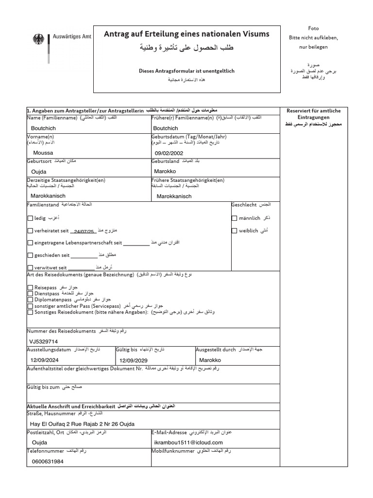 Antrag auf Erteilung eines nationalen Visums Bitte nicht aufkleben,