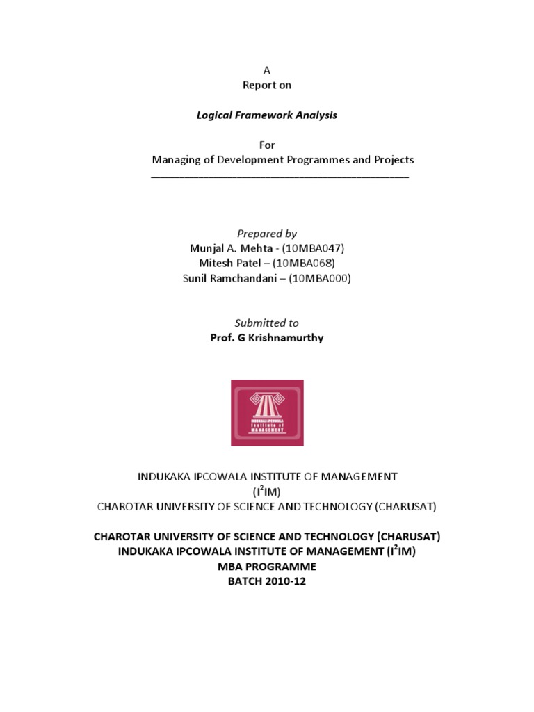 It is hereby certified that this is the bona fide report of work done by Mr. Munjal A. Mehta, Mr. Mitesh Patel & Mr. Sunil Ramchandani in the course Managing of Development Programmes and Projects. This report is based on the independent work carried out by the student.