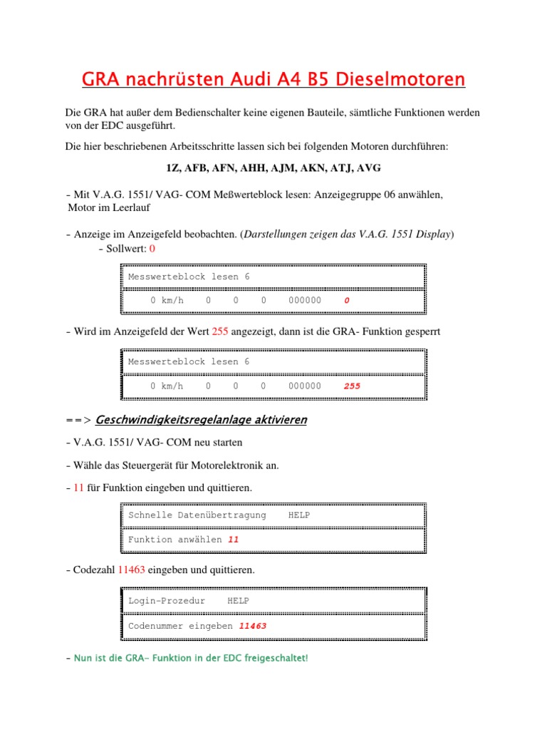 Die GRA hat auer dem Bedienschalter keine eigenen Bauteile, smtliche Funktionen werden von der EDC ausgefhrt. Die hier beschriebenen Arbeitsschritte lassen sich bei folgenden Motoren durchfhren: 1Z, AFB, AFN, AHH, AJM, AKN, ATJ, AVG