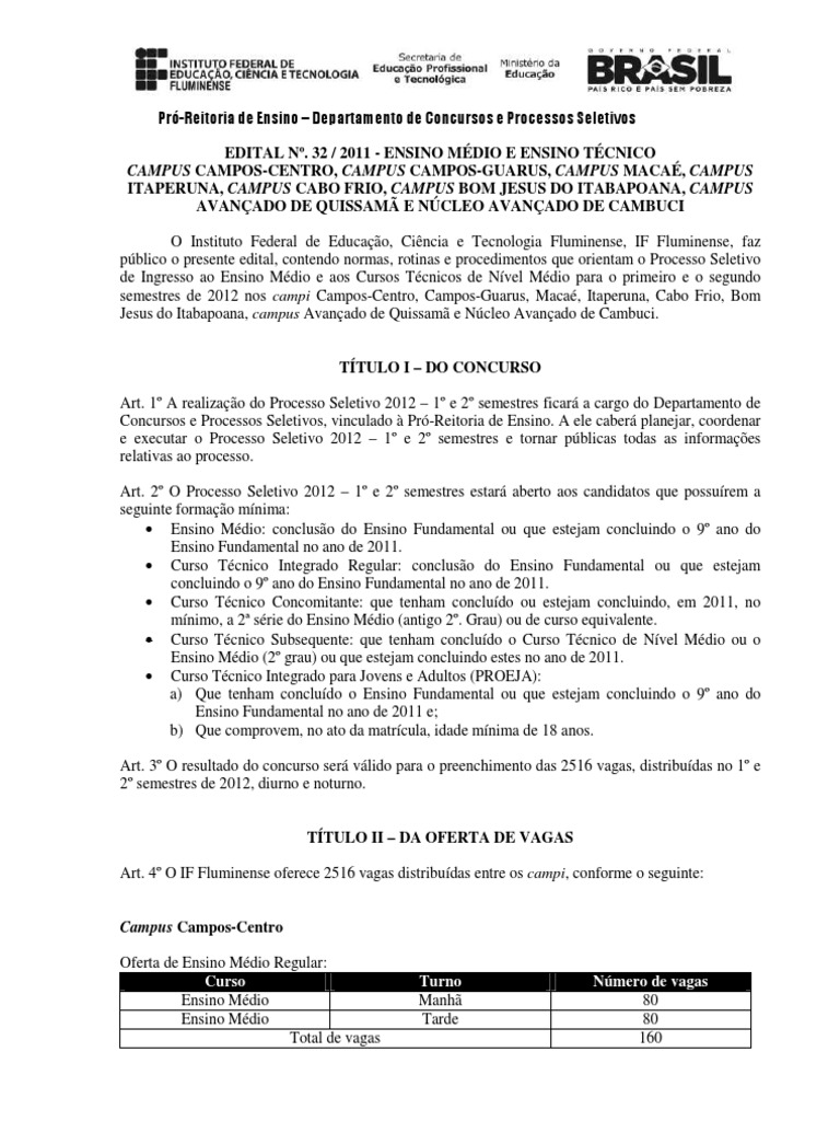 . 32 / 2011 - ENSINO MDIO E ENSINO TCNICO CAMPUS CAMPOS-CENTRO, CAMPUS CAMPOS-GUARUS, CAMPUS MACA, CAMPUS ITAPERUNA, CAMPUS CABO FRIO, CAMPUS BOM JESUS DO ITABAPOANA, CAMPUS AVANADO DE QUISSAM E NCLEO AVANADO DE CAMBUCI O Instituto Federal de Educao, Cincia e Tecnologia Fluminense, IF Fluminense, faz pblico o presente edital, contendo normas, rotinas e procedimentos que orientam o Processo Seletivo de Ingresso ao Ensino Mdio e aos Cursos Tcnicos de Nvel Mdio para o primeiro e o segundo semestres de 2012 nos campi Campos-Centro, Campos-Guarus, Maca, Itaperuna, Cabo Frio, Bom Jesus do Itabapoana, campus Avanado de Quissam e Ncleo Avanado de Cambuci.