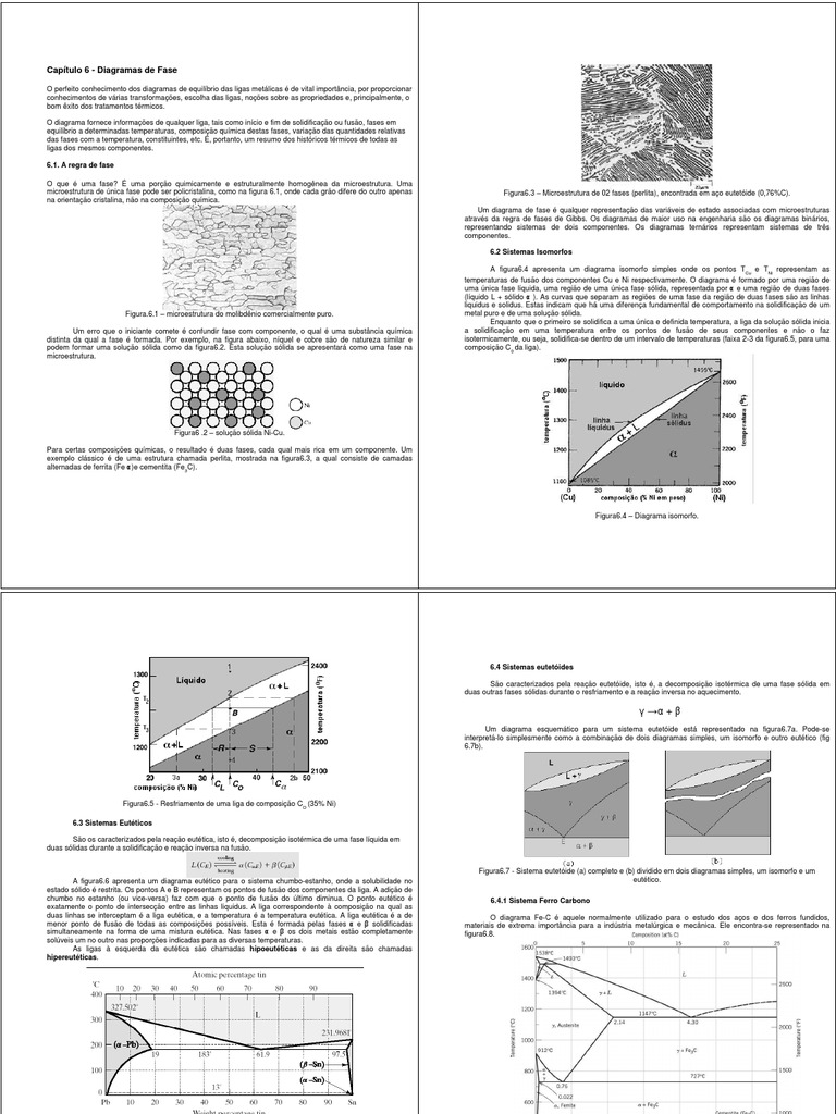 Figura6.5 - Resfriamento de uma liga de composio CO (35% Ni) 6.3 Sistemas Eutticos So os caracterizados pela reao euttica, isto , decomposio isotrmica de uma fase lquida em duas slidas durante a solidificao e reao inversa na fuso. Figura6.7 - Sistema eutetide (a) completo e (b) dividido em dois diagramas simples, um isomorfo e um euttico. 6.4.1 Sistema Ferro Carbono O diagrama Fe-C aquele normalmente utilizado para o estudo dos aos e dos ferros fundidos, materiais de extrema importncia para a indstria metalrgica e mecnica. Ele encontra-se representado na figura6.8.