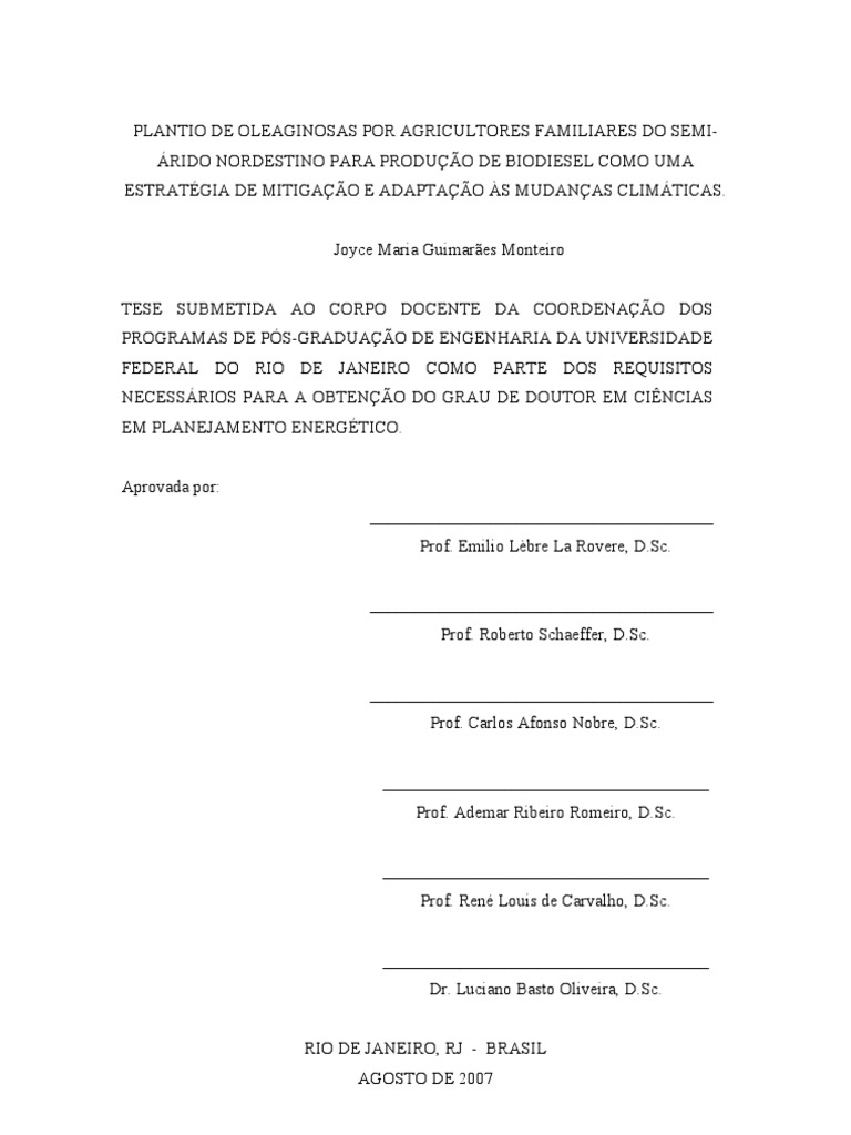MONTEIRO, JOYCE MARIA GUIMARES Plantio de Oleaginosas por Agricultores Familiares do Semi-rido Nordestino para Produo de Biodiesel como uma Estratgia de Mitigao e Adaptao s Mudanas Climticas [Rio de Janeiro] 2007 XIII, 302 p. 29,7 cm (COPPE/UFRJ, D.Sc, Planejamento Energtico, 2007) Tese Universidade Federal do Rio de Janeiro, COPPE 1. Mudanas Climticas 2. Agricultura familiar 3. Produo biodiesel I. COPPE/UFRJ II. Ttulo (srie)