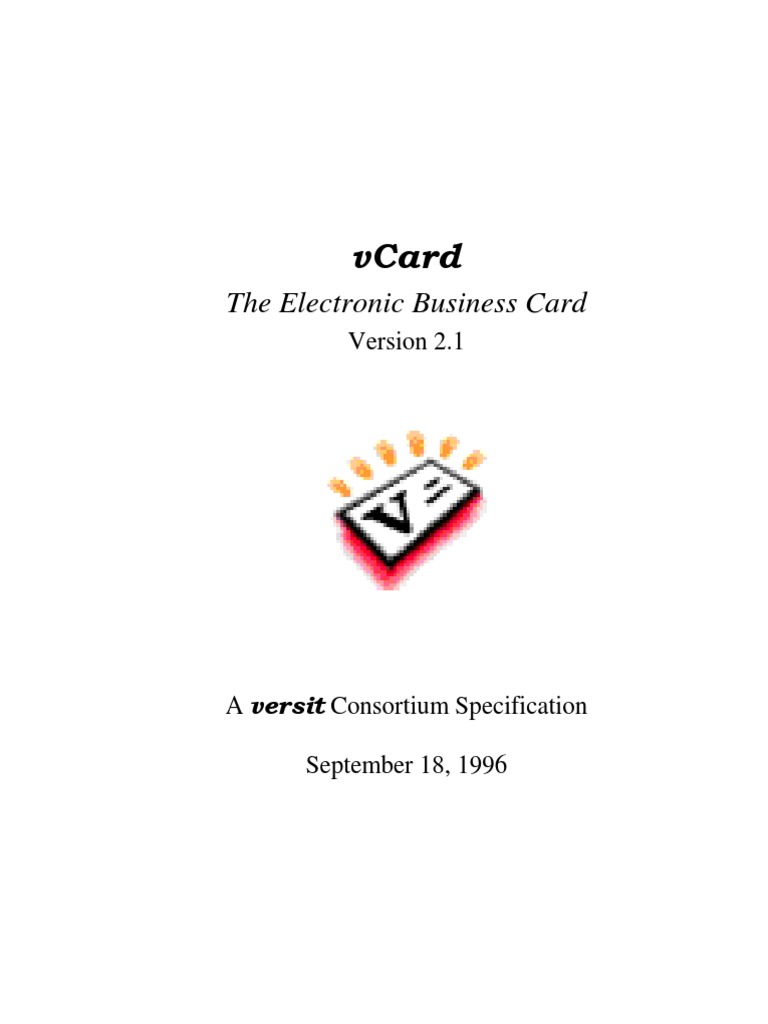 This specification defines a format for an electronic business card, or vCard. The format is suitable as an interchange format between applications or systems. The format is defined independent of the particular method used to transport it. The transport for this exchange might be a file system, point-to-point asynchronous communication, wired-network transport, or some form of unwired transport. A vCard is a data stream consisting of one or more vCard objects. The individual vCard definitions can be identified and parsed within the datastream. The vCard data stream may exist as a persistent form in a file system, document management system, network connection between two network endpoints, or in any other digital transport that has an abstraction of a stream of bytes. Conceptually, a vCard Writer creates vCard data streams and a vCard Reader interprets vCard data streams. The vCard Reader and Writer may be implemented as a single application or as separate applications. It is not the intent of this specification to define the implementation of these processes beyond some fundamental capabilities related to the format of the vCard data stream and a common set of conformance requirements . This specification provides for a clear-text encoding that is intended to be based on the syntax used by the MIME specification (RFC 1521). The encoding of this specification can be used in environments which are constrained to 7-bit transfer encodings, short line lengths, and low bandwidth. In addition, the encoding is simple in order to facilitate the implementation of reader and writer applications on small platforms, such as Personal Digital Assistants (PDA), cellular telephones, or alphanumeric pagers.