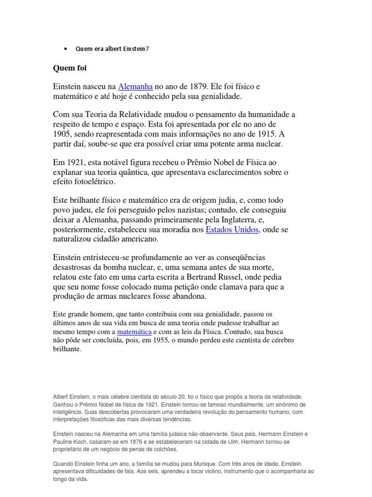 Quem foi Einstein nasceu na Alemanha no ano de 1879. Ele foi fsico e matemtico e at hoje conhecido pela sua genialidade. Com sua Teoria da Relatividade mudou o pensamento da humanidade a respeito de tempo e espao. Esta foi apresentada por ele no ano de 1905, sendo reapresentada com mais informaes no ano de 1915. A partir da, soube-se que era possvel criar uma potente arma nuclear. Em 1921, esta notvel figura recebeu o Prmio Nobel de Fsica ao explanar sua teoria quntica, que apresentava esclarecimentos sobre o efeito fotoeltrico. Este brilhante fsico e matemtico era de origem judia, e, como todo povo judeu, ele foi perseguido pelos nazistas; contudo, ele conseguiu deixar a Alemanha, passando primeiramente pela Inglaterra, e, posteriormente, estabeleceu sua moradia nos Estados Unidos, onde se naturalizou cidado americano. Einstein entristeceu-se profundamente ao ver as conseqncias desastrosas da bomba nuclear, e, uma semana antes de sua morte, relatou este fato em uma carta escrita a Bertrand Russel, onde pedia que seu nome fosse colocado numa petio onde clamava para que a produo de armas nucleares fosse abandona.