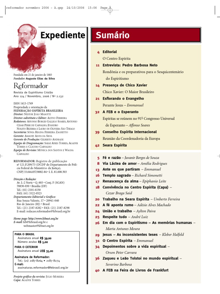 42 Seara Esprita 5 8 13 16 17 18 20 22 24 25 26 29 31 34 36 40 F e razo Juvanir Borges de Souza Via Lctea de amor Amlia Rodrigues Ante os que partiram Emmanuel Templo sagrado Richard Simonetti Renascena da alma Epiphanio Leite Convivncia no Centro Esprita (Capa) Cezar Braga Said Trabalho na Seara Esprita Umberto Ferreira A f aponta rumo Adsio Alves Machado Unio e trabalho Aylton Paiva Respeite tudo Andr Luiz Em dia com o Espiritismo As memrias humanas Marta Antunes Moura Jesus As inconsistentes teses Kleber Halfeld O Centro Esprita Emmanuel Depoimentos sobre a vida espiritual Orson Peter Carrara Zaqueu e Leo Tolstoi no mundo espiritual Severino Barbosa A FEB na Feira de Livros de Frankfurt