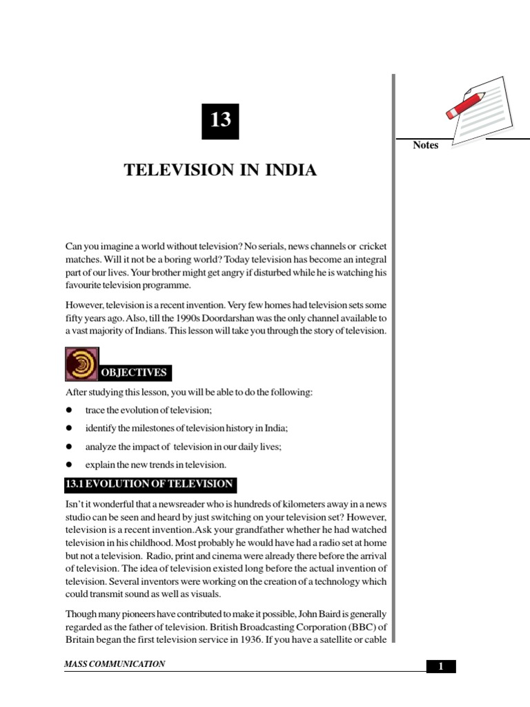 OBJECTIVES After studying this lesson, you will be able to do the following: trace the evolution of television; identify the milestones of television history in India; analyze the impact of television in our daily lives; explain the new trends in television. 13.1 EVOLUTION OF TELEVISION Isnt it wonderful that a newsreader who is hundreds of kilometers away in a news studio can be seen and heard by just switching on your television set? However, television is a recent invention.Ask your grandfather whether he had watched television in his childhood. Most probably he would have had a radio set at home but not a television. Radio, print and cinema were already there before the arrival of television. The idea of television existed long before the actual invention of television. Several inventors were working on the creation of a technology which could transmit sound as well as visuals. Though many pioneers have contributed to make it possible, John Baird is generally regarded as the father of television. British Broadcasting Corporation (BBC) of Britain began the first television service in 1936. If you have a satellite or cable