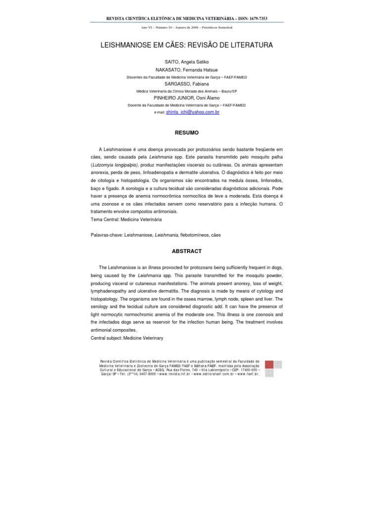 Revista Cientfica Eletrnica de Medicina Veterinria uma publicao semestral da Faculdade de Medicina Veterinria e Zootecnia de Gara FAMED/FAEF e Editora FAEF, mantidas pela Associao Cultural e Educacional de Gara ACEG. Rua das Flores, 740 Vila Labienpolis CEP: 17400-000 Gara/SP Tel: (0**14) 3407-8000 www.revista.inf.br www.editorafaef.com.br www.faef.br.
