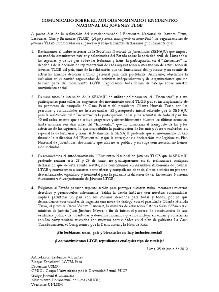 A pocos das de la realizacin del autodenominado I Encuentro Nacional de Jvenes Trans, Lesbianas, Gais y Bisexuales (TLGB) Aqu y ahora, construyendo un nuevo Per, las organizaciones de jvenes TLGB involucradas en el proceso y abajo firmantes declaramos pblicamente que: 1. Rechazamos el turbio accionar de la Secretara Nacional de Juventudes (SENAJU) que impuso un modelo organizativo tutelar y colonizador del Estado sobre la sociedad civil, de Lima sobre las regiones, y de los gais sobre las lesbianas y trans: la participacin en el Encuentro no dependa de la decisin de representacin de cada organizacin o mecanismo de articulacin de jvenes TLGB del pas, sino de la calificacin que un funcionario del gobierno y un comit de activistas limeos decidan a ttulo personal para cada postulante. Asimismo, objetamos la inclusin en el comit organizador de activistas independientes y de organizaciones que no forman parte del movimiento LGTB. Repudiamos toda forma de tutelaje sobre nuestro movimiento social. 2. Denunciamos la intencin de la SENAJU de utilizar polticamente el Encuentro y a sus participantes para callar las exigencias del movimiento social TLGB por el incumplimiento de las promesas de campaa de Gana Per y del presidente Ollanta Humala Tasso con las personas y comunidades no heterosexuales. El presupuesto inicial ofrecido por la SENAJU para la realizacin del Encuentro y la participacin de las y los activistas de todo el pas fue 40 mil soles, monto que se redujo progresiva y sistemticamente durante las ltimas semanas, hasta anunciar seis das antes del Encuentro que no financiar el transporte de las y los activistas de las regiones, lo que imposibilita la participacin de los ms pobres y excluidos, en especial la de lesbianas y trans. Actualmente, la SENAJU pretende que el movimiento LTGB financie la realizacin del Encuentro y que le entregue una declaracin que legitime su Plan Nacional de Juventudes, documento que an no es pblico y en cuya construccin no hemos sido incluidos. 3. Desconocemos el autodenominado I Encuentro Nacional de Jvenes TLGB que la SENAJU pretende realizar este 28 y 29 de junio, no participaremos en l, rechazamos cualquier declaracin que de este evento resulte, nos constituimos en Asamblea Autnoma de Jvenes LTGB y convocamos a nuestras compaeras y compaeros de todo el pas a iniciar un proceso descentralizado, equitativo y horizontal para la prxima realizacin de un Encuentro Nacional Autnomo y Autogestionario de Jvenes LTGB. 4. Exigimos al Estado peruano urgente accin para proteger nuestras vidas, reconocer nuestros derechos y promoverlos activamente. Saldar la deuda histrica con nuestras comunidades implica garantizar un pas con los mismos derechos para todas y todos, por lo que demandamos con carcter de urgencia una mesa de dilogo con el presidente Ollanta Humala Tasso, el premier Oscar Valdez Dancuart, la ministra de educacin Patricia Salas OBrien y el ministro de justicia Juan Jimnez Mayor, a fin de iniciar el proceso de construccin de una verdadera poltica de juventudes y derechos humanos que nos incluya en orden y coherencia con los compromisos asumidos con nuestras comunidades en el plan de gobierno La Gran Transformacin, el Compromiso por la Democracia y la Hoja de Ruta. Sin lesbianas, trans, gais y bisexuales no hay inclusin social! Los movimientos LTGB repudiamos cualquier tipo de tutelaje! Lima, 25 de junio de 2012 Articulacin Lesbianas Vibrantes Bloque Estudiantil LGTBI-Per Diversitas USMP GPUC - Grupo Universitario por la Diversidad Sexual PUCP Grupo Juvenil A tu manera Movimiento Homosexual de Lima (MHOL) Versiones UNMSM