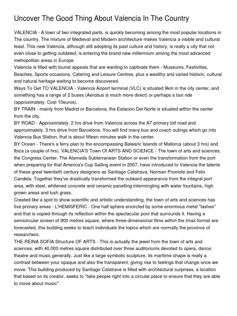 VALENCIA - A town of two integrated parts, is quickly becoming among the most popular locations in The country. The mixture of Medieval and Modern architecture makes Valencia a visible and cultural feast. This new Valencia, although still adopting its past culture and history, is really a city that not even close to getting outdated, is entering the brand new millennium among the most advanced metropolitan areas in Europe. Valencia is filled with tourist appeals that are wanting to captivate them - Museums, Festivities, Beaches, Sports occasions, Catering and Leisure Centres, plus a wealthy and varied historic, cultural and natural heritage waiting to become discovered. Ways To Get TO VALENCIA - Valencia Airport terminal (VLC) is situated 9km in the city center, and something has a range of 2 buses (Aerobus is much more direct) or perhaps a taxi ride (approximately. Cost 10euros). BY TRAIN - mainly from Madrid or Barcelona, the Estacion Del Norte is situated within the center from the city. BY ROAD - Approximately. 2 hrs drive from Valencia across the A7 primary toll road and approximately. 3 hrs drive from Barcelona. You will find many bus and coach outings which go into Valencia Bus Station, that is about fifteen minutes walk in the center. BY Ocean - There's a ferry plan to the encompassing Balearic Islands of Mallorca (about 3 hrs) and Ibiza (a couple of hrs). VALENCIA'S Town Of ARTS AND SCIENCE - The town of arts and sciences, the Congress Center, The Alameda Subterranean Station or even the transformation from the port when preparing for that America's Cup Sailing event in 2007, have introduced to Valencia the talents of these great twentieth century designers as Santiago Calatrava, Norman Promote and Felix Candela. Together they've drastically transformed the outward appearance from the integral port area, with steel, whitened concrete and ceramic panelling intermingling with water fountains, high grown areas and lush grass. Created like a spot to show scientific and artistic understanding, the town of arts and sciences has five primary areas - L'HEMISFERIC - One half sphere encircled by some enormous metal "lashes" and that is copied through its reflection within the spectacular pool that surrounds it. Having a semicircular screen of 900 metres square, where three-dimensional films within the Imax format are forecasted, this building seeks to teach individuals the topics which are normally the province of researchers. THE REINA SOFIA Structure OF ARTS - This is actually the jewel from the town of arts and sciences, with 40,000 metres square distributed over three auditoriums devoted to opera, dance, theatre and music generally. Just like a large symbolic sculpture, its maritime shape is really a contrast between your opaque and also the transparent, giving rise to feelings that change once we move. This building produced by Santiago Calatrave is filled with architectural surprises, a location that based on its creator, seeks to "take people right into a circular place to ensure that they are able to move about music".