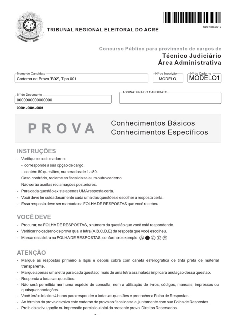 - Marque as respostas primeiro a lpis e depois cubra com caneta esferogrfica de tinta preta de material transparente. - Marque apenas uma letra para cada questo; mais de uma letra assinalada implicar anulao dessa questo. - Responda a todas as questes. - No ser permitida nenhuma espcie de consulta, nem a utilizao de livros, cdigos, manuais, impressos ou quaisquer anotaes. - Voc ter o total de 4 horas para responder a todas as questes e preencher a Folha de Respostas. - Ao trmino da prova devolva este caderno de prova ao fiscal da sala, juntamente com sua Folha de Respostas. - Proibida a divulgao ou impresso parcial ou total da presente prova. Direitos Reservados.
