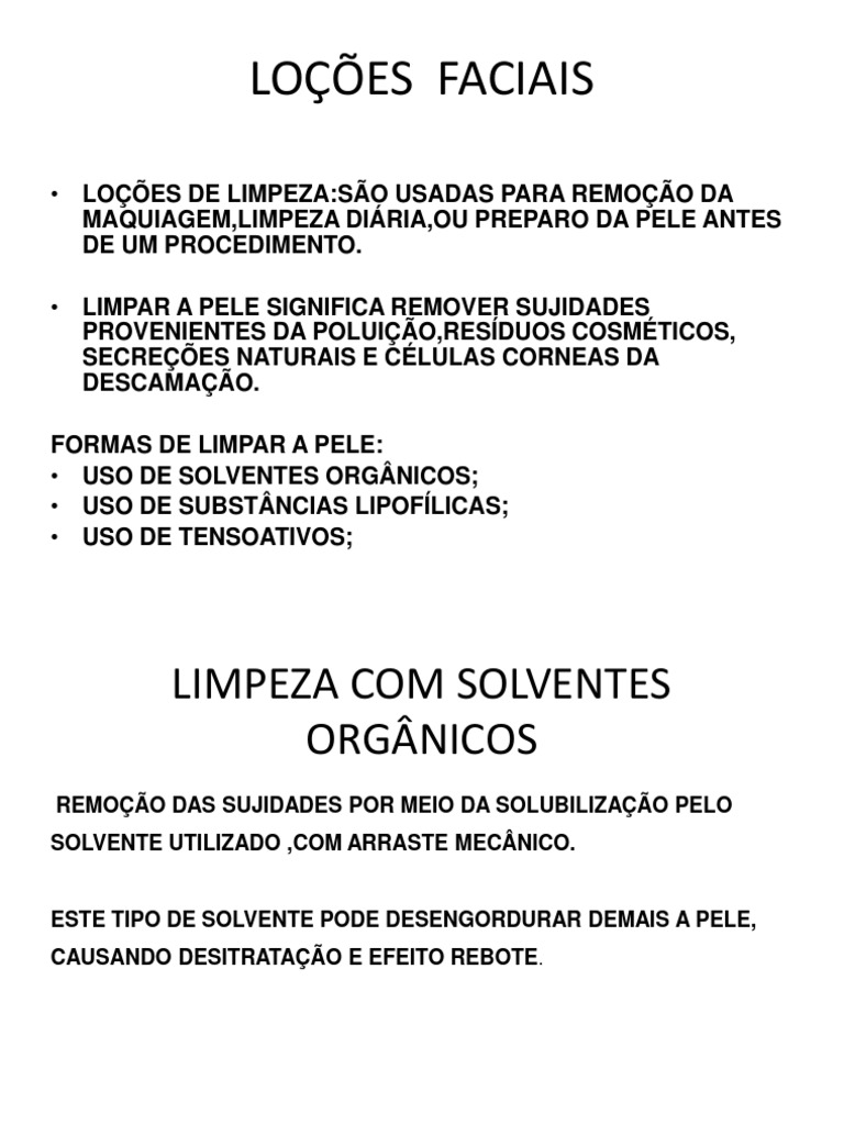 LOES DE LIMPEZA:SO USADAS PARA REMOO DA MAQUIAGEM,LIMPEZA DIRIA,OU PREPARO DA PELE ANTES DE UM PROCEDIMENTO. LIMPAR A PELE SIGNIFICA REMOVER SUJIDADES PROVENIENTES DA POLUIO,RESDUOS COSMTICOS, SECREES NATURAIS E CLULAS CORNEAS DA DESCAMAO. FORMAS DE LIMPAR A PELE: USO DE SOLVENTES ORGNICOS; USO DE SUBSTNCIAS LIPOFLICAS; USO DE TENSOATIVOS;