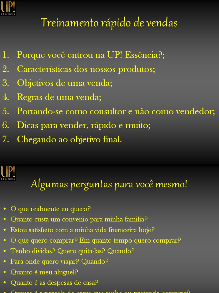 1. 2. 3. 4. 5. 6. 7. Porque voc entrou na UP! Essncia?; Caractersticas dos nossos produtos; Objetivos de uma venda; Regras de uma venda; Portando-se como consultor e no como vendedor; Dicas para vender, rpido e muito; Chegando ao objetivo final.