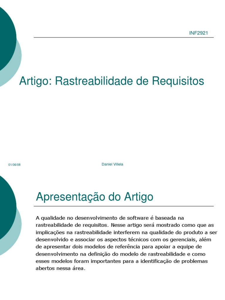 A qualidade no desenvolvimento de software baseada na rastreabilidade de requisitos. Nesse artigo ser mostrado como que as implicaes na rastreabilidade interferem na qualidade do produto a ser desenvolvido e associar os aspectos tcnicos com os gerenciais, alm de apresentar dois modelos de referncia para apoiar a equipe de desenvolvimento na definio do modelo de rastreabilidade e como esses modelos foram importantes para a identificao de problemas abertos nessa rea.