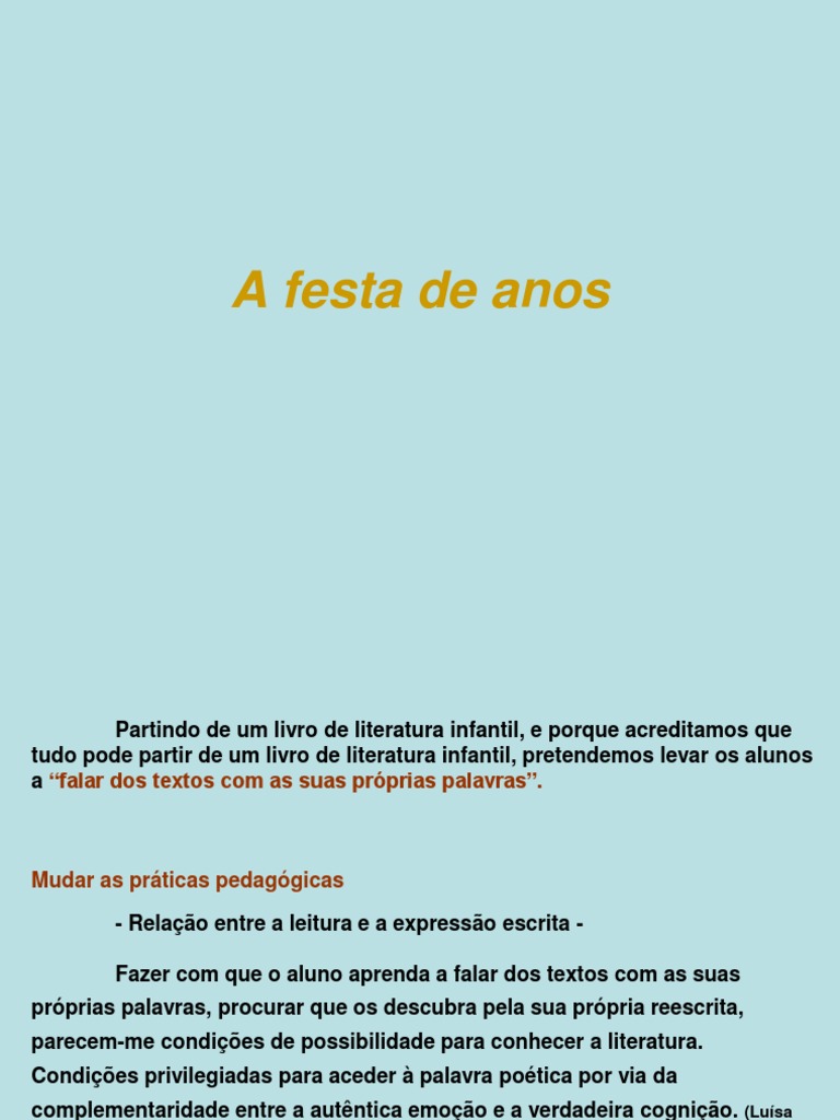 Partindo de um livro de literatura infantil, e porque acreditamos que tudo pode partir de um livro de literatura infantil, pretendemos levar os alunos a falar dos textos com as suas prprias palavras.