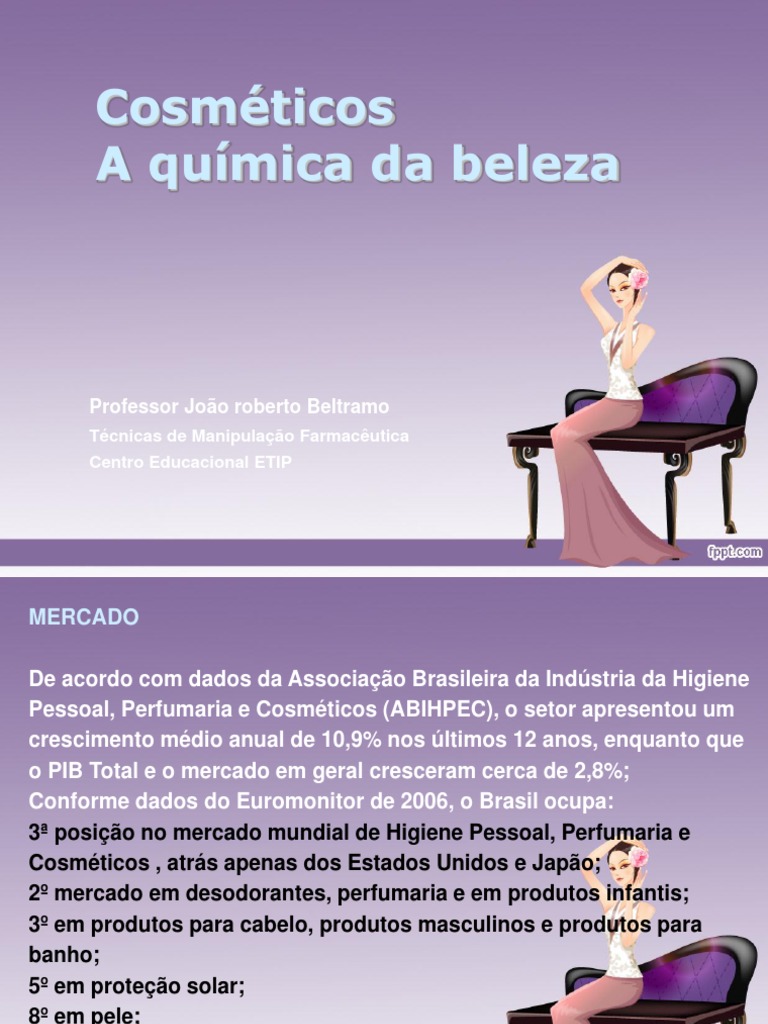 Cosmticos so substncias, misturas ou formulaes usadas para melhorar ou para proteger a aparncia ou o odor do corpo humano.