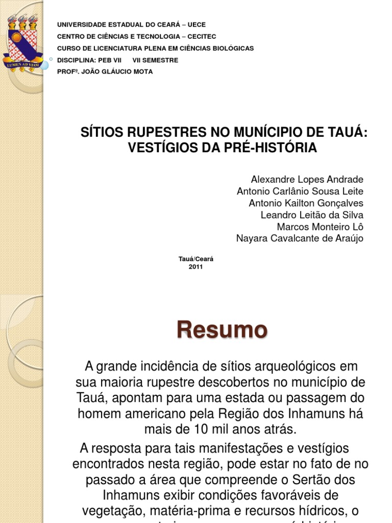 Diante das inmeras marcas deixadas pelo homem primitivo no municpio de Tau, sendo estas de origem ltica ou rupestre, conclumos ser esta rea como uma provvel zona de habitao de povos pr-histricos que viveram parcial ou integralmente por estas terras, e que registraram sua forma de vida, acontecimentos e at crenas religiosas, atravs de smbolos pictrios com o intuito de difundir sua cultura e at mesmo demarcar suas terras.