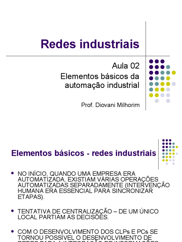 NO INCIO, QUANDO UMA EMPRESA ERA AUTOMATIZADA, EXISTIAM VRIAS OPERAES AUTOMATIZADAS SEPARADAMENTE (INTERVENO HUMANA ERA ESSENCIAL PARA SINCRONIZAR ETAPAS). TENTATIVA DE CENTRALIZAO DE UM NICO LOCAL PARTIAM AS DECISES. COM O DESENVOLVIMENTO DOS CLPs E PCs SE TORNOU POSSVEL O DESENVOLVIMENTO DE REDES PARA A INTEGRAO DE INFORMAES. AS REDES INDUSTRIAIS PASSARAM A TER UMA DIVISO EM TRS CAMADAS.