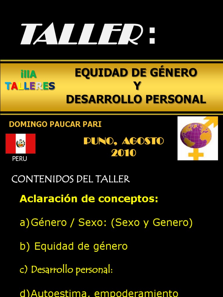Equidad de Gnero Hablamos de Equidad de Gnero cuando existe igualdad de oportunidades para que hombres y mujeres participen en todos los mbitos de la vida: en lo domestico, en lo econmico, en lo social, en lo poltico, en lo cultural.